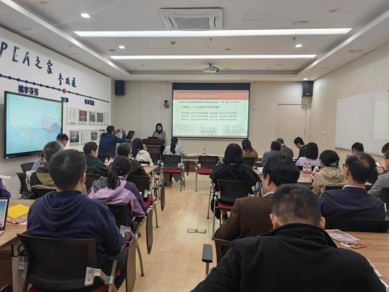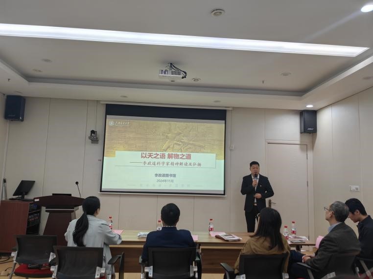 随后,图书馆刘音作《以天之语 解物之道——李政道科学家精神解读及弘扬》专题报告。刘音围绕“物理巨擘”、“赤子情怀”、“科艺双馨”三个主题深入解读李政道先生的科学家精神,并结合具体事例阐述了其在新时代的重要性和实践意义。刘音在报告中谈到,李政道先生一生致力于科学研究,他的创新精神、家国情怀和国际视野为后人树立了榜样,希望李政道的科学家精神走进院系,不断激励科学工作者提升自身科研能力,献身科学报国事业,让科学精神代代传承。