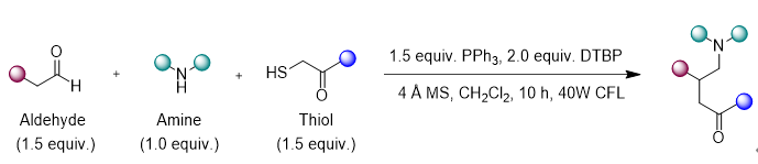 该研究利用醛、仲胺、巯基化合物作为底物,实现了光催化的三组分自由基类曼尼希反应,可以高效率得到γ-羰基-叔胺类化合物。