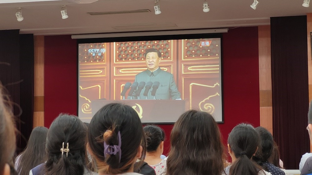 当五星红旗飘扬起来的那一刻,当国歌响亮萦绕耳旁的那一刻,我的心中感受到满腔热情!让我感受最深的,还是当习总书记说到,“中国人民也绝不允许任何外来势力欺负、压迫、奴役我们,谁妄想这样干,必将在14亿多中国人民用血肉筑成的钢铁长城面前碰得头破血流!”全场都忍不住激动鼓掌欢呼!回望历史,中国一步步实现了从站起来,富起来到强起来的伟大飞跃。现在,我们的国家已经昂首屹立在世界的东方,再也不畏惧任何霸权强权!作为青年党员,我们依然要牢记初心,坚守始终,为党的下一个百年辉煌,发一份光,发一份热!“请党放心,强国有我!“