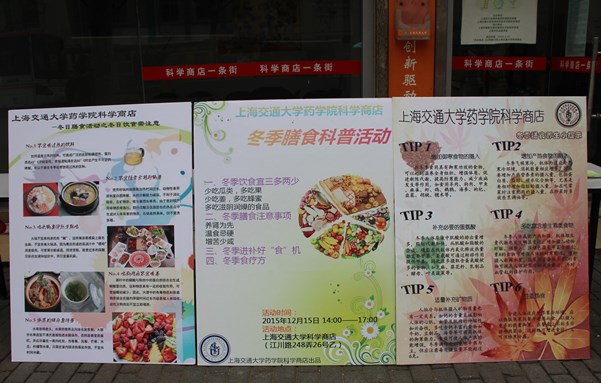 进入冬季以来,气温骤降,天寒地冻,很多人往往只注重了外在的保暖防寒,却忽视了通过膳食保养的重要性,而冬季正是通过食疗调养身体增强体质的好“食”机。为了让更多的人了解和注重冬季膳食养生,女优写真 科学商店的志愿者们将所学的医药养生知识学以致用,于12月15日14:00在科学商店一条街举办了此次冬季膳食科普活动,向附近的市民朋友义务宣传冬季膳食健康知识,获得了广大市民的一致好评。